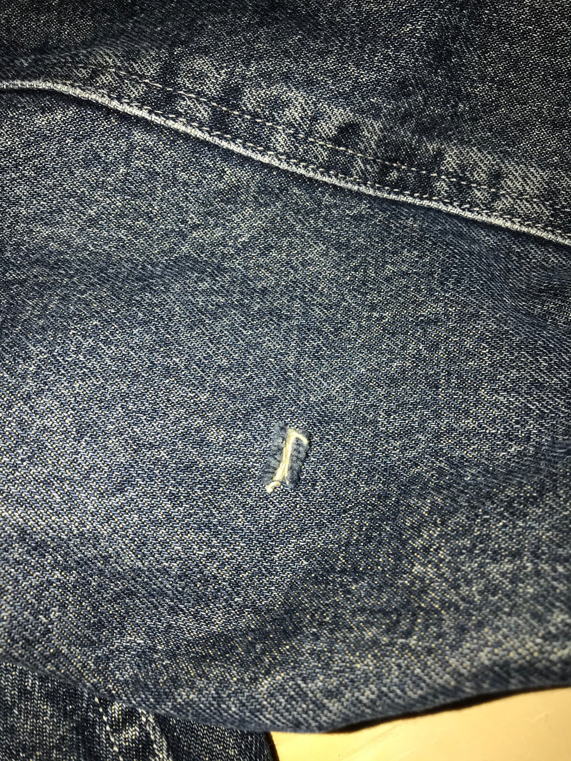Noticeable wear and tear around neck and sleeve for a great vintage look.